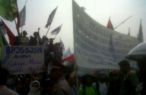 Ribuan buruh yang melakukan long march dari Bundaran HI sudah mencapai Istana Merdeka, Jl Merdeka Utara, Jakarta Pusat. Tibanya ribuan buruh ini membuat lalu lintas di kawasan Istana macet total.